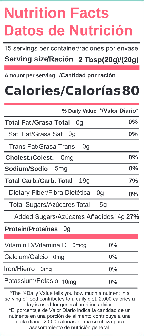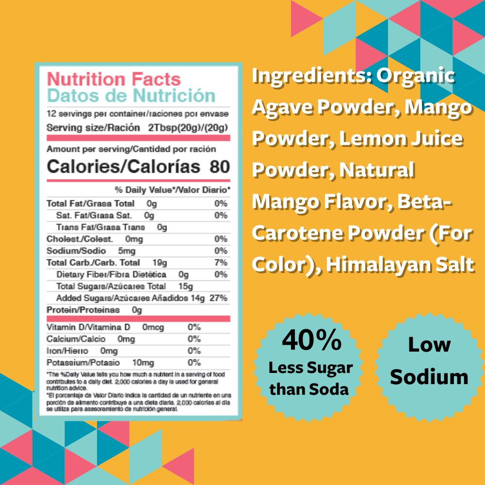 Ingredients: Organic Agave Powder, Mango Powder, Lemon Juice Powder, Natural Mango Flavor, Beta-Carotene (For Color), Himalayan Salt